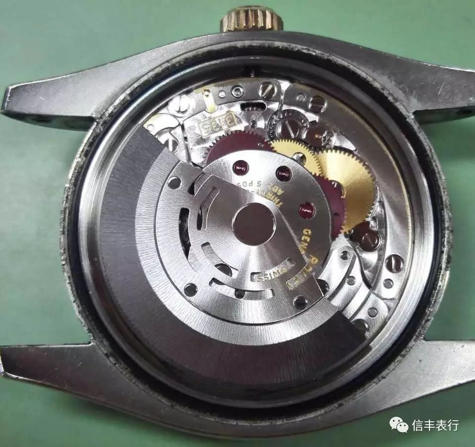 机芯拆出来后的正面盘面图,它logo的雕刻平整,棱角分明,它的肉眼辨识度是区别于所有类似劳力士的高仿表的首要辨别条件。